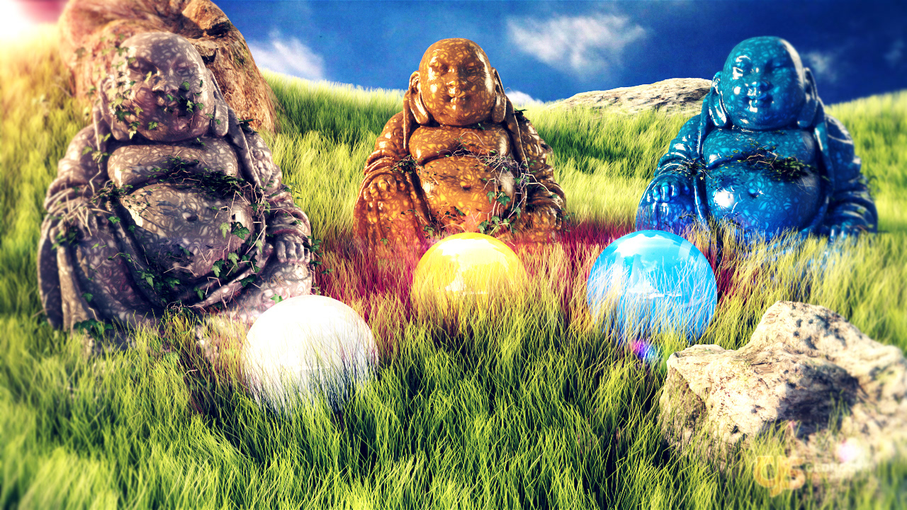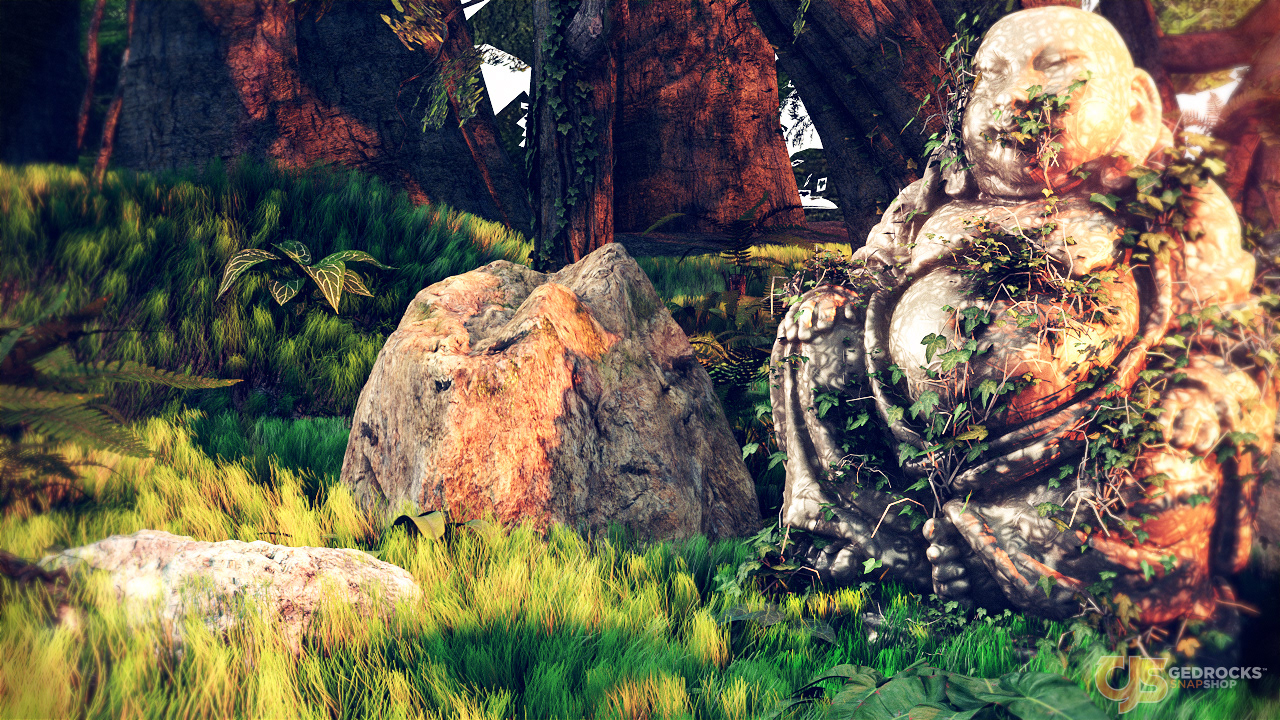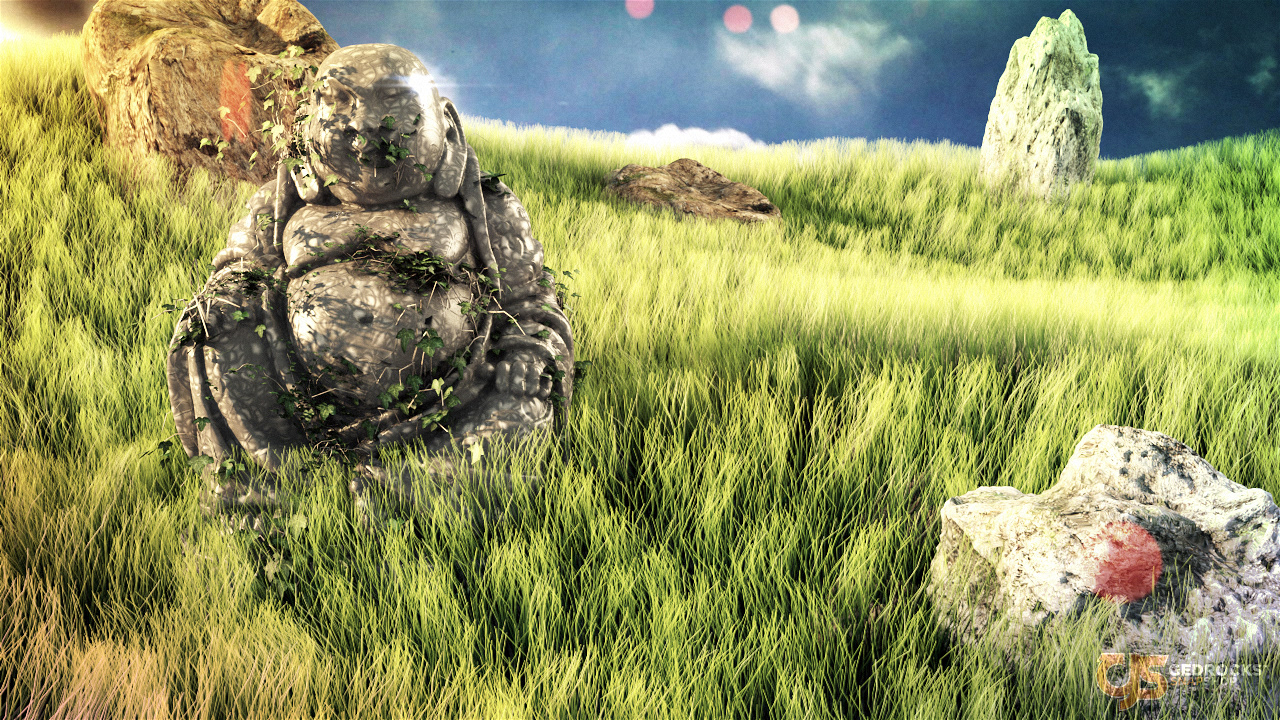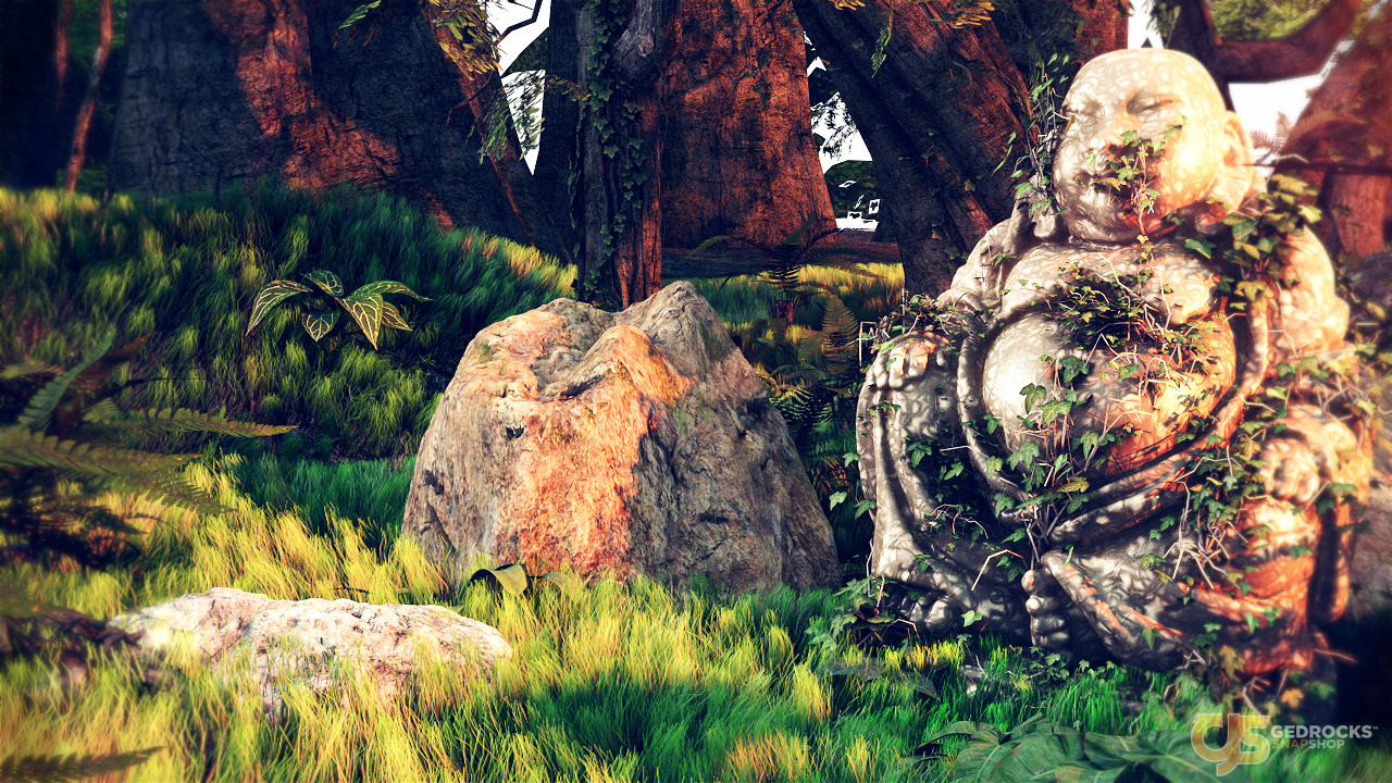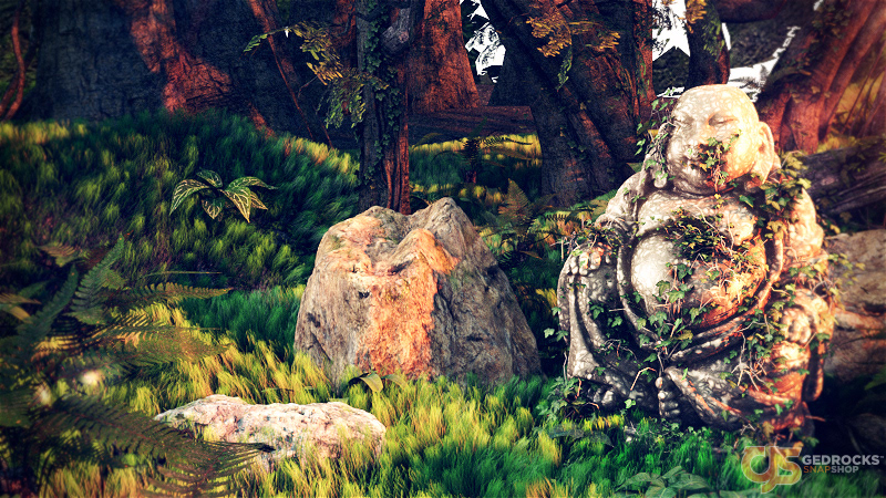 Render showcasing an ancient buddha in nature